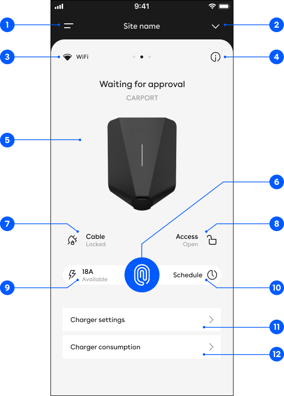 Hier hast du Zugriff auf deine Einstellungen und die Verbrauchsdaten für deinen Standort. Du erreichst diese Site Card entweder über den Pfeil oder durch Wischen nach unten auf der Ladegeräteansicht. Du kannst folgende Einstellungen anzeigen und ändern: